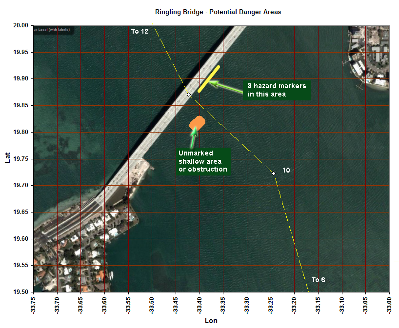 Dave Munro and I went out again on Friday in Dave’s boat. (If you are not familiar with HepCat, it a very hi-tech boat with sophisticated GPS and sonar recording equipment). We took a number of additional sweeps of the area of interest that we told you about last week and reaffirmed our findings. At location 27o 19.817’ N 82o 33.399’ W a peak was found with 7.65 feet at MLLW. The significance is that on a negative tide, deep draft boats could encounter serious trouble as several already have. In fact, these accidents may have inadvertently lowered this peak to its current depth. I have notified FDOT and WCIND of this finding so that they investigate this new area and see that it is marked. In the meantime, stay clear. The attached picture provides the location of the area of concern and also shows the chart location of marks that currently exist including Fl R 4s 16ft 3M “10” which appears to be a safe course from the center of the bridge. However, neither Dave nor I take any responsibility for the accuracy of information in this email or in the attached chart.